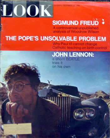 ライヴ活動中止後、ジョンが出演した映画「ぼくの戦争」特集。当時の雑誌の状態にしては結構良いと思います。ページがはずれていたり抜け落ちているという事もありません。表紙左下に意味不明な住所(オハイオ州)のラベルが貼ってあるのはこの雑誌がダイレクトメールで届いた時のものでしょうか!?ジョンの記事はカラー写真含め5ページに及びます。その他センスの良い広告が時代を超越して楽しませてくれます。